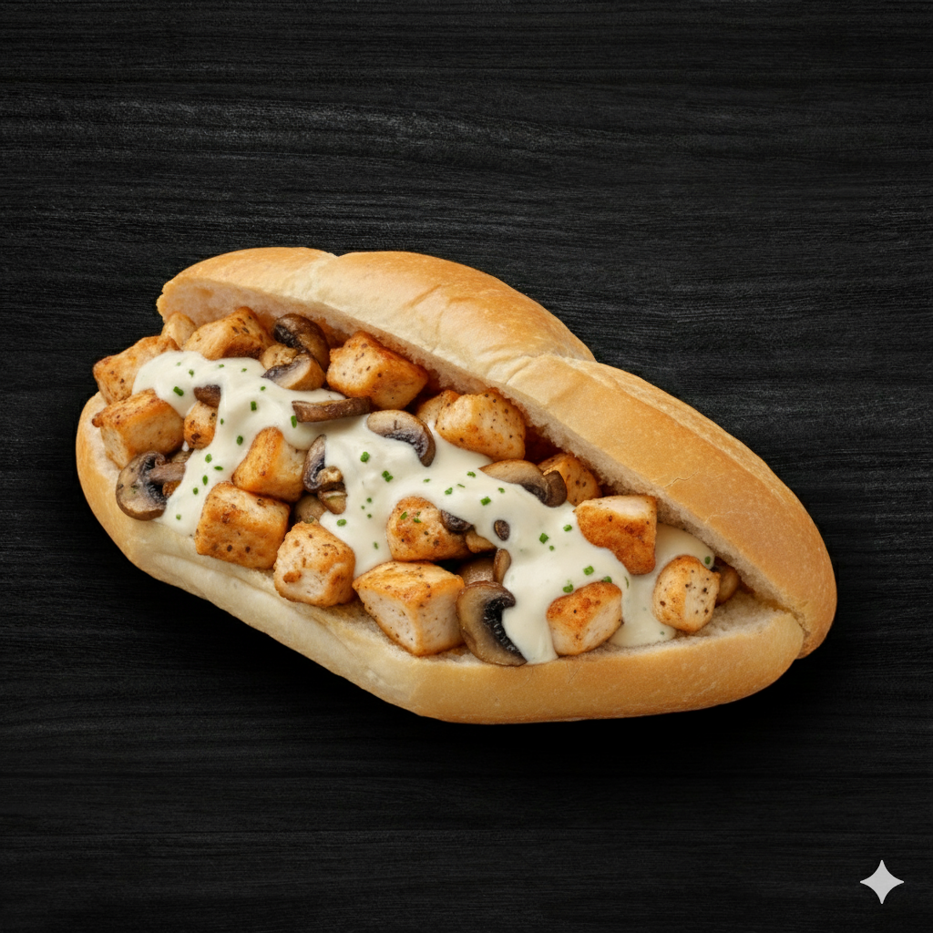 Escalope de poulet, Crème fraîche, Champignons, servis avec une portion de frites.