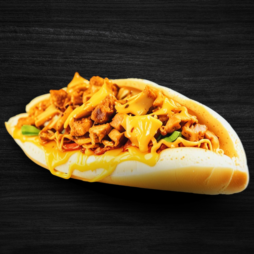 Chicken Curry, Poivrons, Sauce Chili Thaï, Fromage, servis avec une portion de frites.