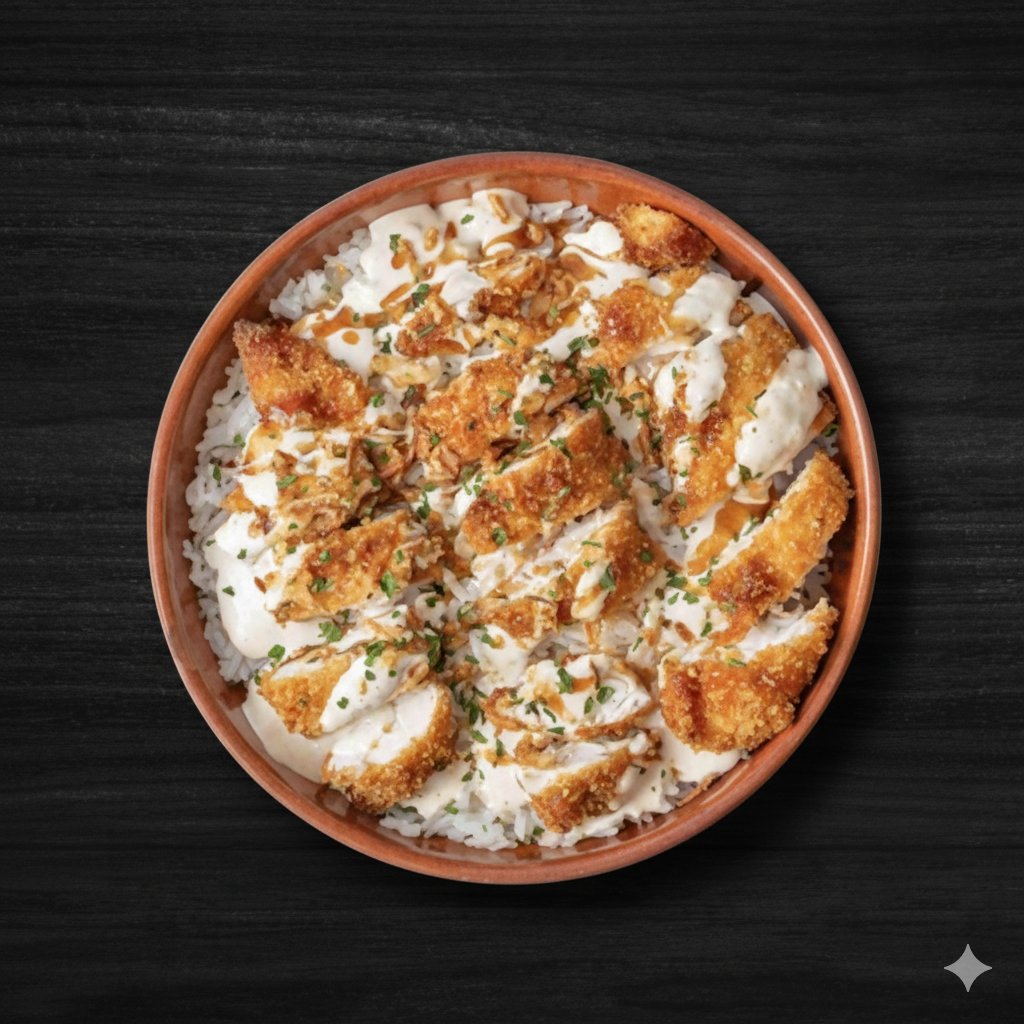 Filet de poulet pané, Poivrons, Oignons Crispy, servis avec du riz.